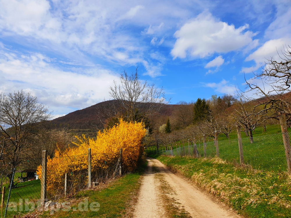 Calverbühl, Sonnenfels, Rossfeld und die Obstbaumblüte im Ermstal (gelb)