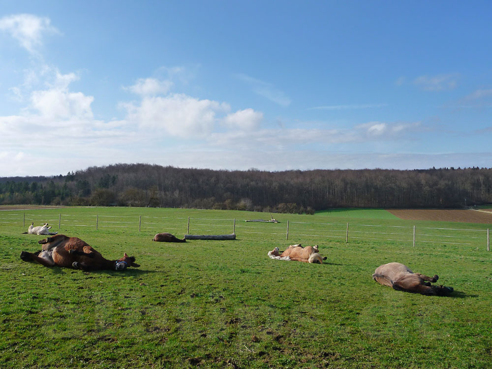 Das Picknick in der wärmenden Aprilsonne macht schläfrig, doch frisch gestärkt geht es für Mulis, Pferde und Menschen weiter durch Feld und Wald bis zur Wanderreitstation. Wer glaubt, dass die vierbeinigen Begleiter jetzt müde sind, kann ihnen noch beim Wälzen und Toben auf der Koppel zusehen. Für die müden Reiter gibt es einen mehr als herzlichen Empfang beim Kaffeetrinken und später beim Abendessen.