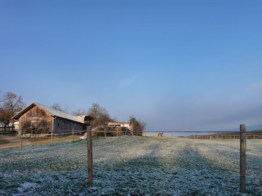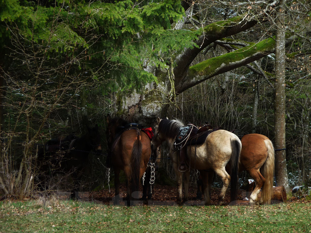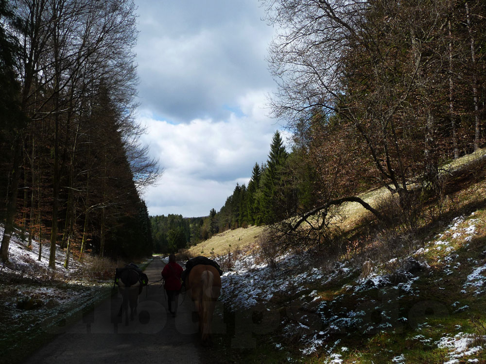 Nach gemütlichem Frühstück, Putzen und Satteln scheint wieder die Sonne. Beim Aufbruch ist der meiste Schnee schon geschmolzen, nur in die schattigen Stellen am Waldrand schmiegt er sich noch ein.