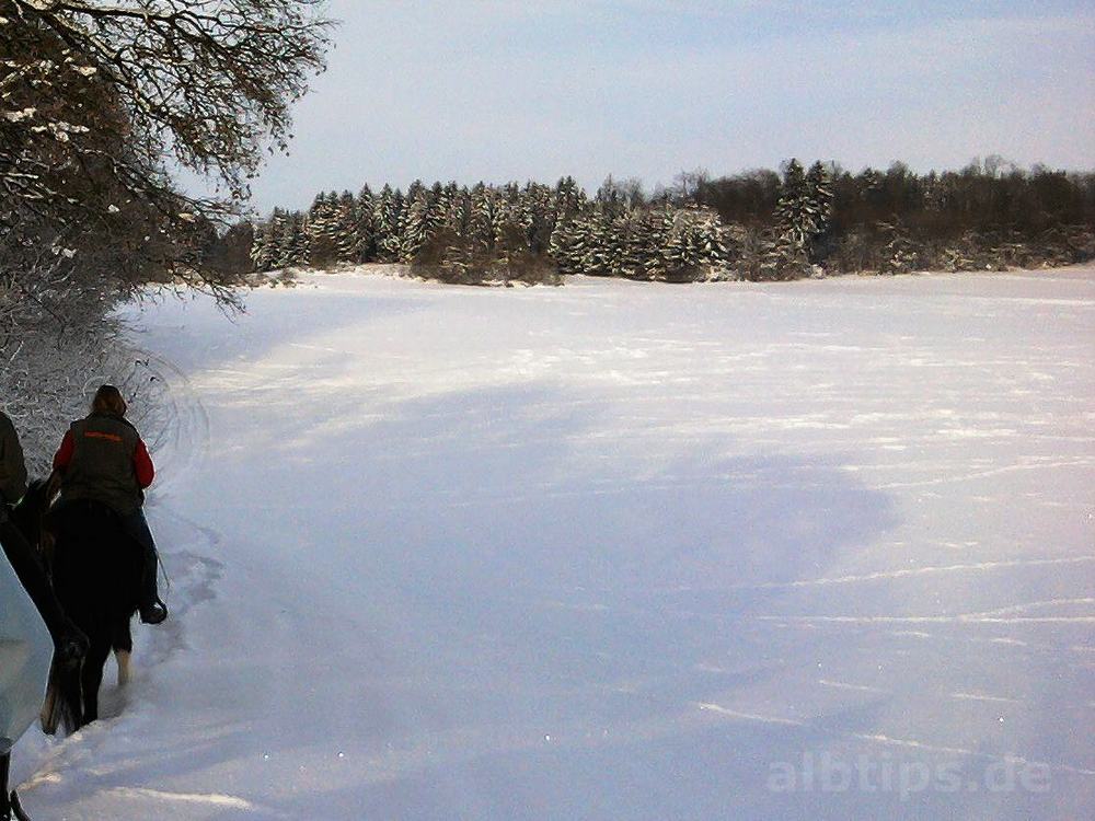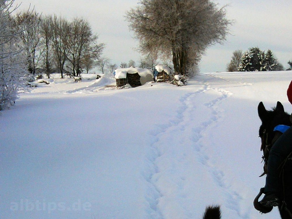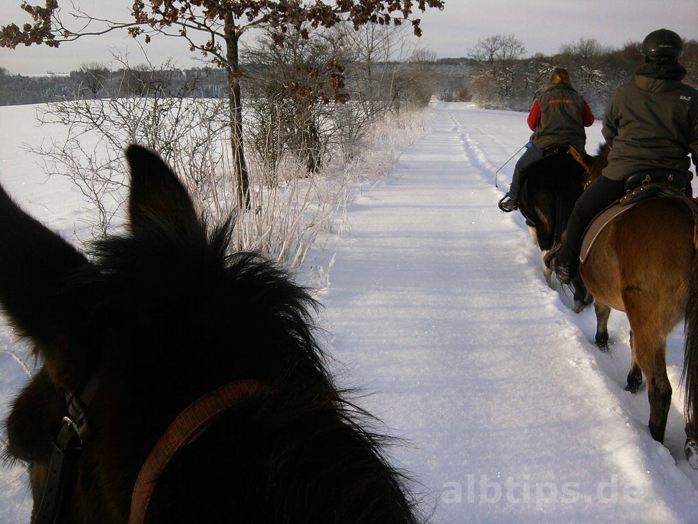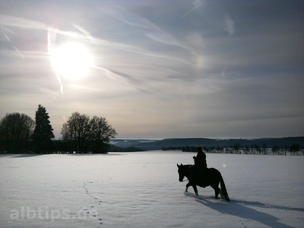 Nach eisiger Nacht zeigt sich die Sonne sogar mit Heiligenschein. Die Pferde und Maultiere stapfen durch den kaum gespurten Tiefschnee. Trab und Galopp machen einen Riesenspaß, aber trotz des leichten Pulverschnees wird es schnell anstrengend. Ein schöner Winterausflug mit wie immer großartigen Begleitern.