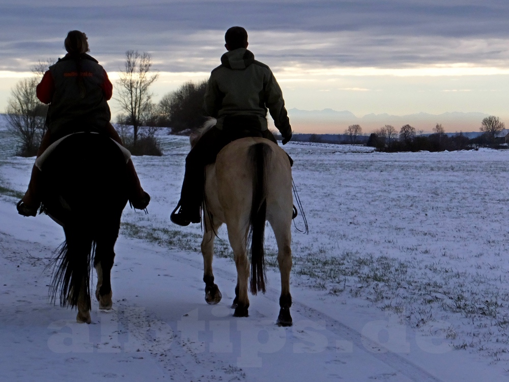 Der Winter auf der Schwäbischen Alb ist schon etwas ganz besonderes: Auf der unbewaldeten Albhochfläche und nach etwas Schneefall gibt es viel Licht, welches man in den Tälern oft vermisst. Dank der gut durchdachten Rittführung konnten wir heute immer wieder das großartige und beeindruckende Alpenpanorama genießen.
