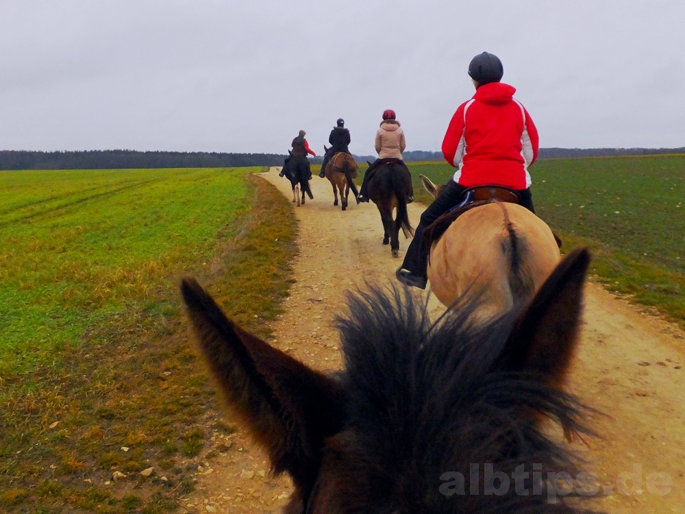 Am westlichen Horizont klarte sogar etwas der Himmel auf und sorgte für Kontraste in den Wolken. Maultier jedoch beschäftigte ein ganz anderes Phänomen. Immer wieder schaute es nach links in den Wald, um den wir quasi herumritten, und spitzte die langen Ohren. Bald war ich mir sicher, dass dort Wild sein musste – vermutlich Wildschweine. Die ließen sich aber glücklicherweise nicht blicken und wir erreichten schließlich alle glücklich den Stall.