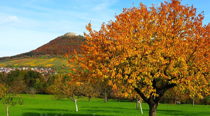 Bei herrlichem Goldenem-Oktober-Wetter ist eine Tour durch Streuobstwiesen mit Blick zum Albtrauf und zu den bunten Weinbergen besonder schön.