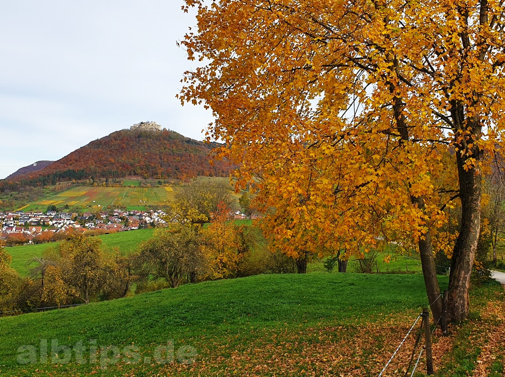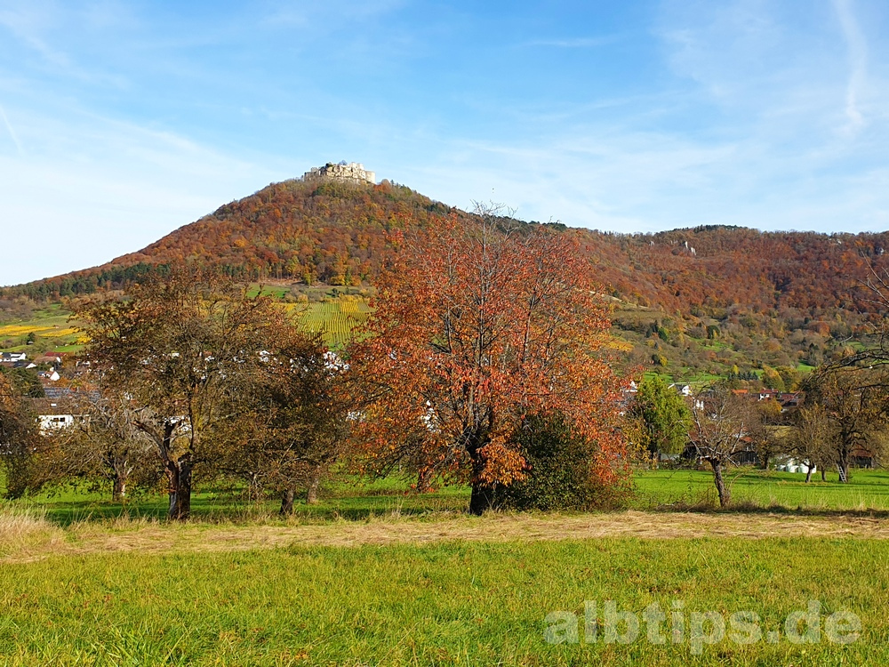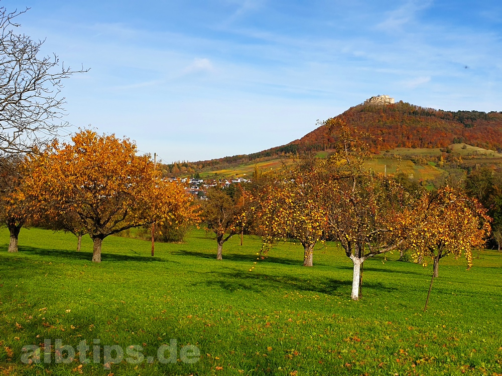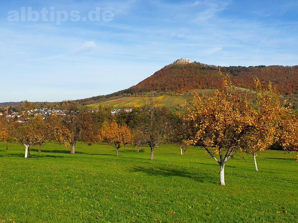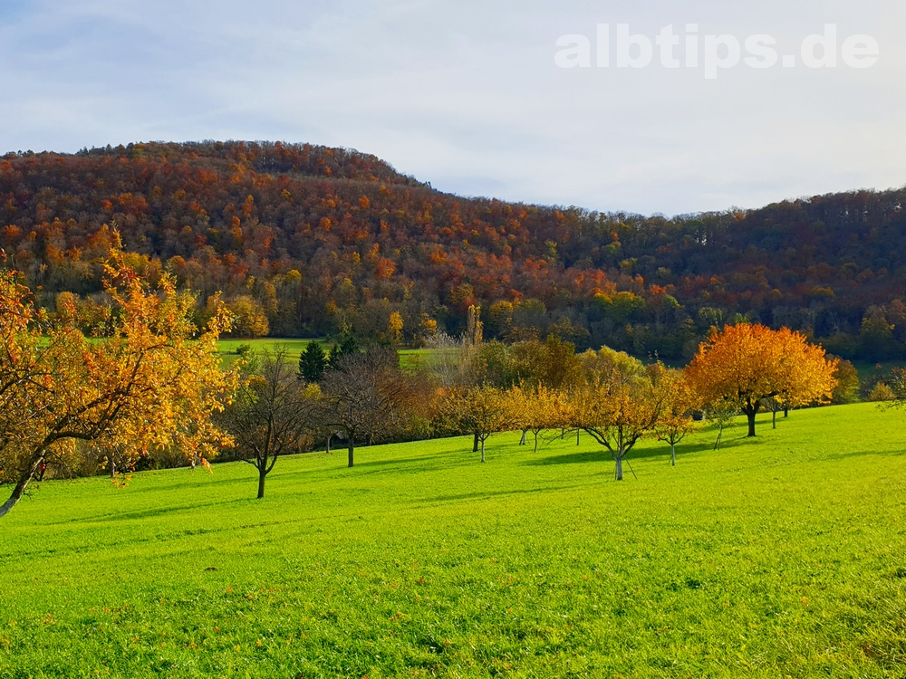 Bei herrlichem Goldenem-Oktober-Wetter ist eine Tour durch Streuobstwiesen mit Blick zum Albtrauf und zu den bunten Weinbergen besonder schön.