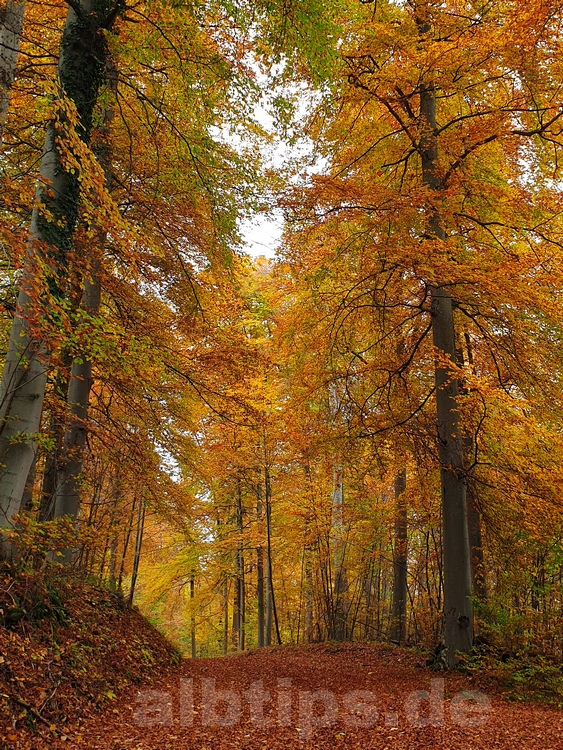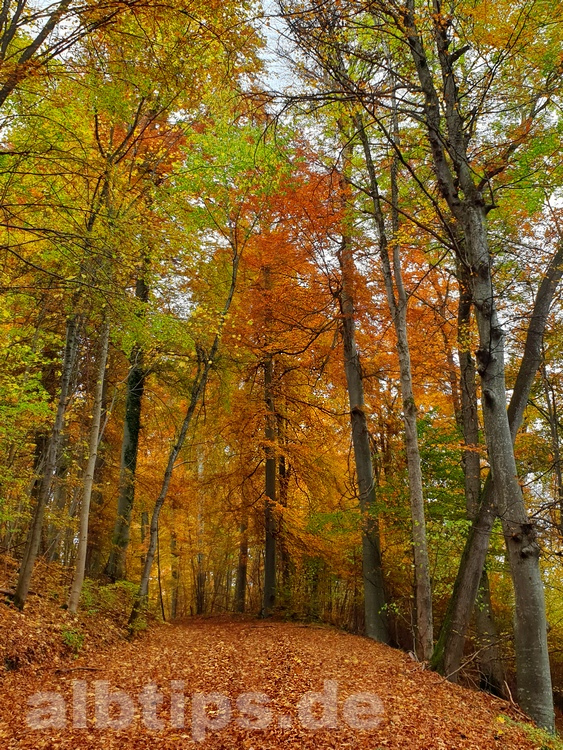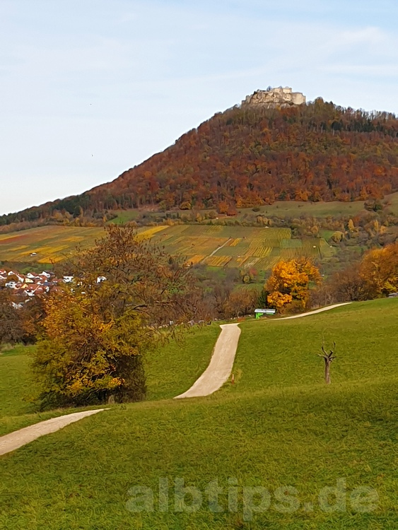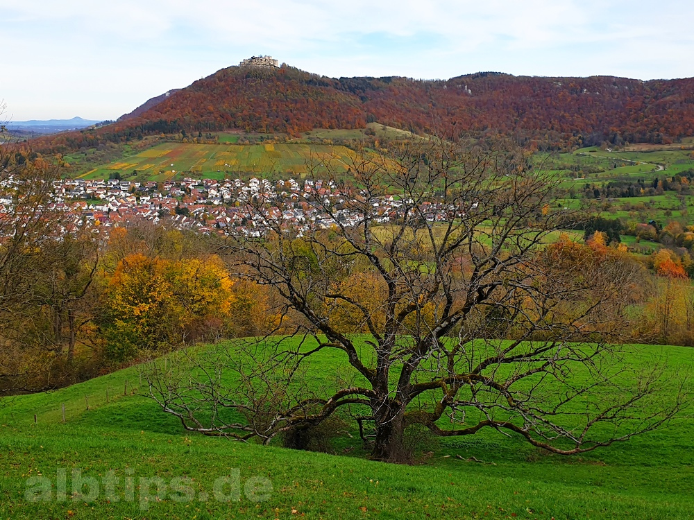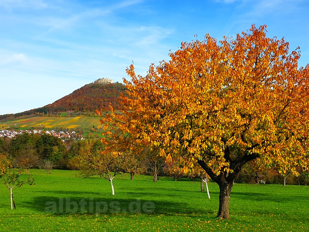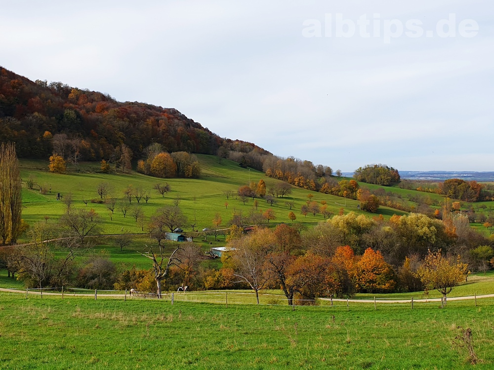 Bei herrlichem Goldenem-Oktober-Wetter ist eine Tour durch Streuobstwiesen mit Blick zum Albtrauf und zu den bunten Weinbergen besonder schön.