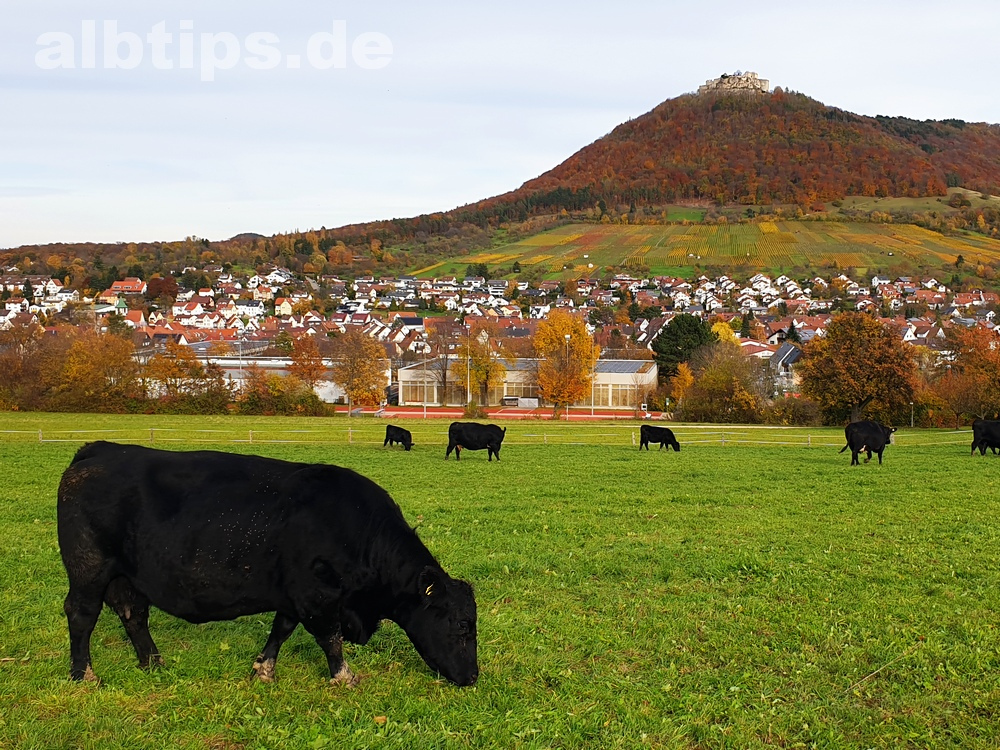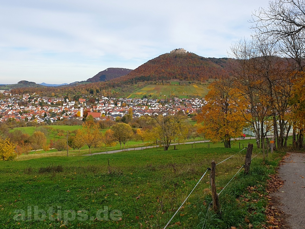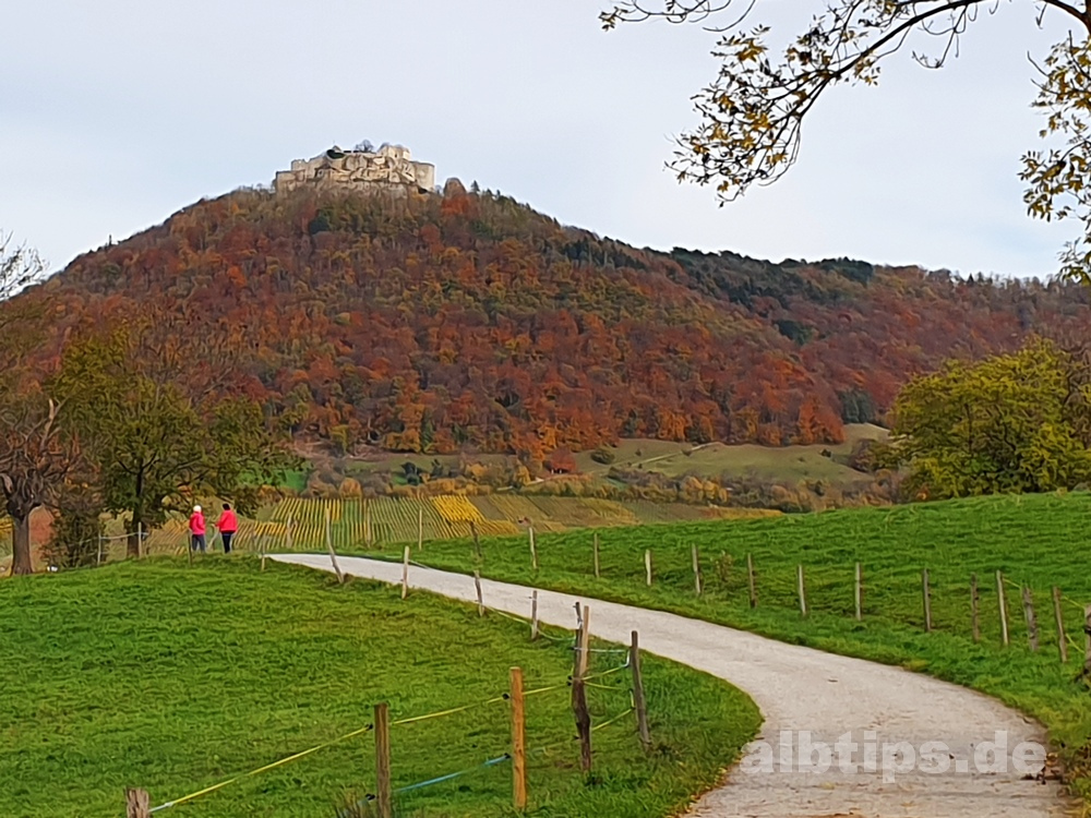 Die schmale Straße verläuft zwischen Streuobstwiesen und bietet grandiose Ausblicke auf den Albtrauf, hinüber zur Burgruine Hohenneuffen und zu den Weinbergen unterhalb. Der Weg wird zum Schotterweg und nach einem guten Kilometer macht er eine Linkskurve.