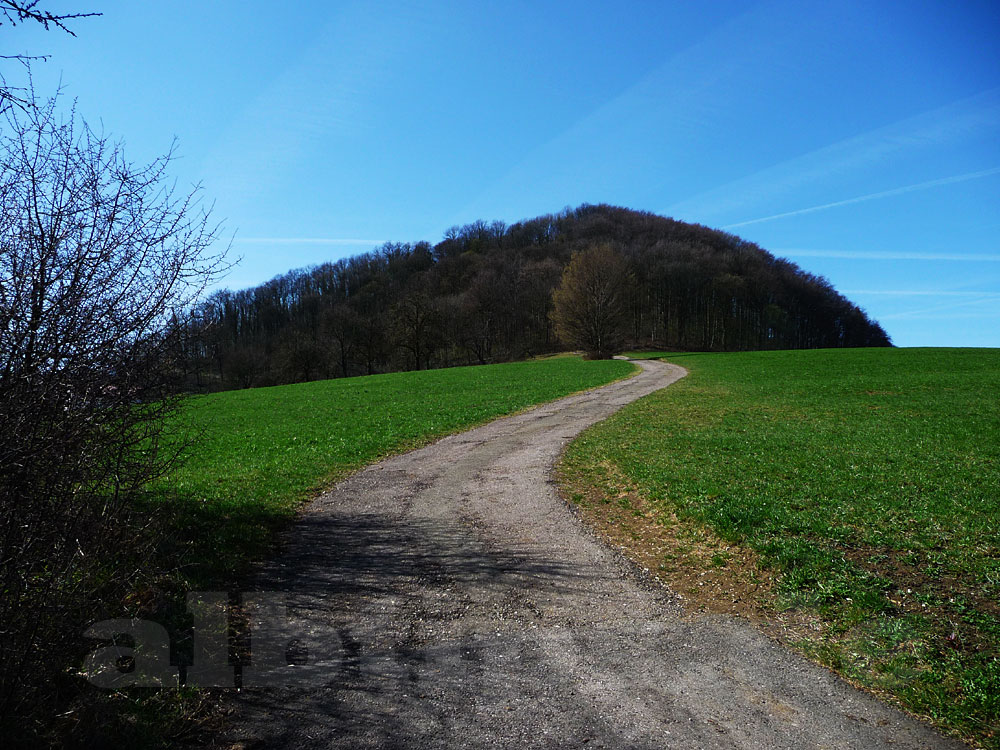 Gegenüber führt ein breiter Schotterweg hinab, nach einer großen Rechtskehre wandert man in Richtung Westen. Oberhalb des Waldrands wendet man sich erneut nach rechts und umrundet den halben Berg, bis man auf den Asphaltweg trifft, der auf gleichem Wege zurückführt.