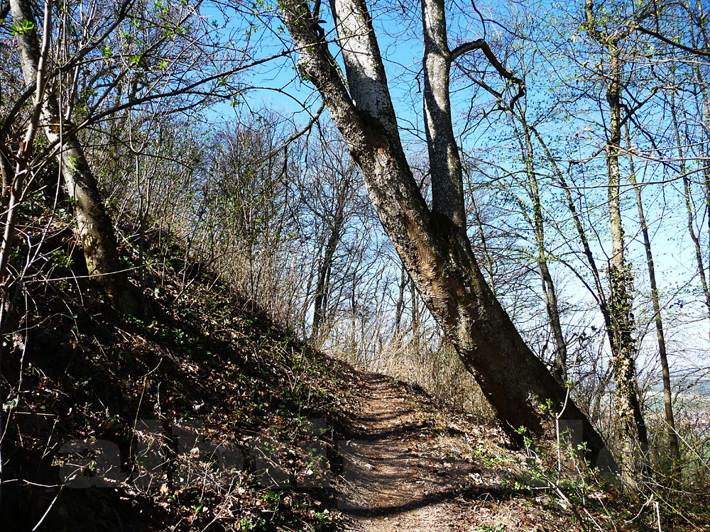 Auf dem breiten Weg geht es auf der Rückseite des Käpfles hinab, dann rechts herum um dem Gipfel, die Allee entlang und links am Hofgut Alteburg vorbei. Man zweigt links auf den Weg mit Wegzeichen Blaue Raute ab, der zunächst parallel oberhalb der L383 verläuft und dann als schmaler, steiler Pfad durch den Wald hinab führt.