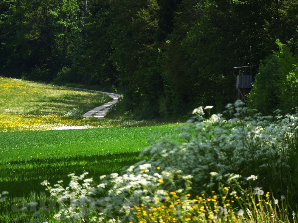 Wo das Sträßchen eine leichte Rechtskurve macht, geht man geradeaus den Waldweg weiter. Bald kommt man aus dem Wald heraus und orientiert sich danach immer am links befindlichen Waldrand.