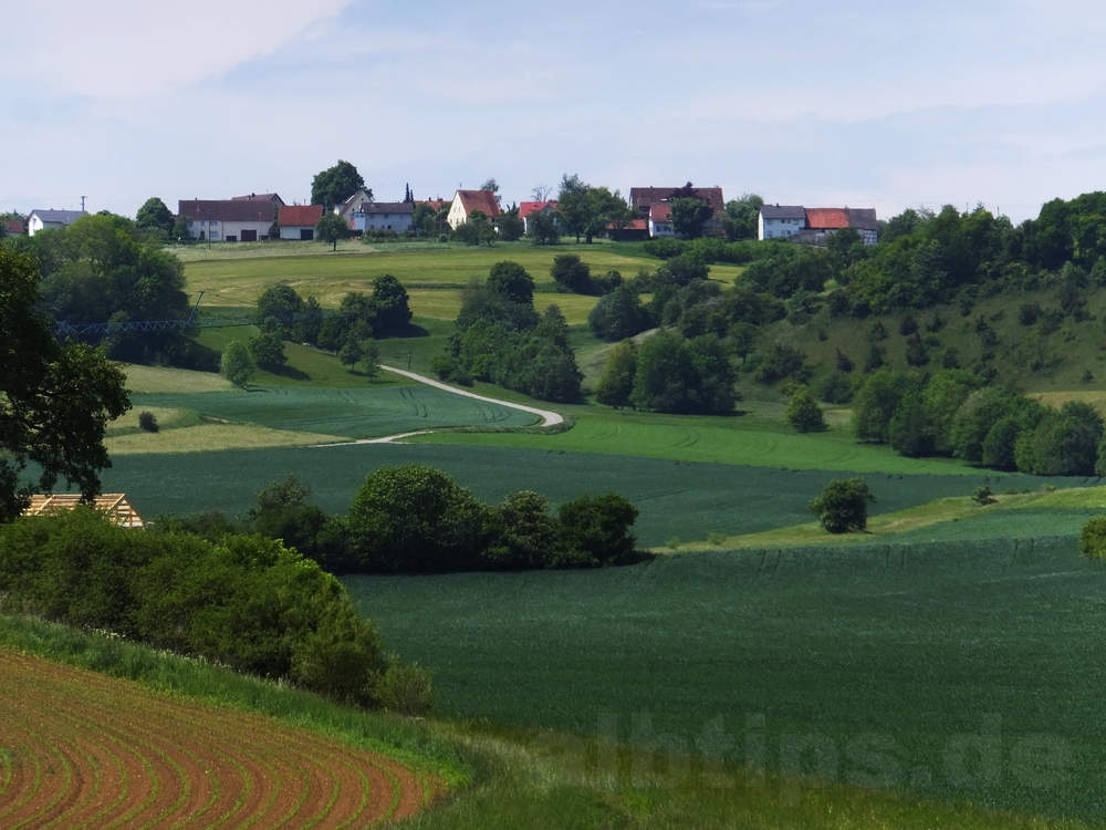 Auf die Dorfverbindungsstraße biegt man links ab, folgt bei der Häuseransammlung mit Namen Warmtal der Beschilderung des HW2 nach links, wendet sich vor dem Waldrand nach rechts, kurz darauf erneut rechts, genießt den schönen Blick, zweigt vor dem Waldrand nochmals rechts ab und kehrt auf dem schon vom Beginn der Tour bekannten, kurzen Wegstück zum Parkplatz zurück.
