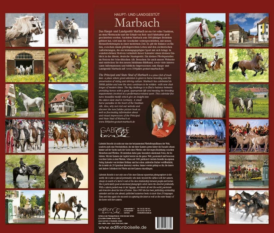 „Der Pferdekalender aus dem Gestüt Marbach (Edition Boiselle) umfasst auf 24 Seiten (2 Motive pro Monat) die Geschichte und Architektur, die Idylle, die Pferde und Menschen dort sowie, das aktuelle Leben eines großen Gestütes. Seit 30 Jahren ist die Fotografin Gabriele Boiselle immer wieder Gast in Marbach und hat über die Jahrzehnte hinweg unvergessliche Impressionen eingefangen, die jedes Jahr in einem Kalender aufgelegt werden.“