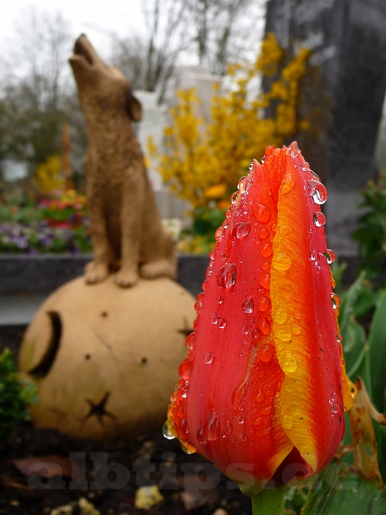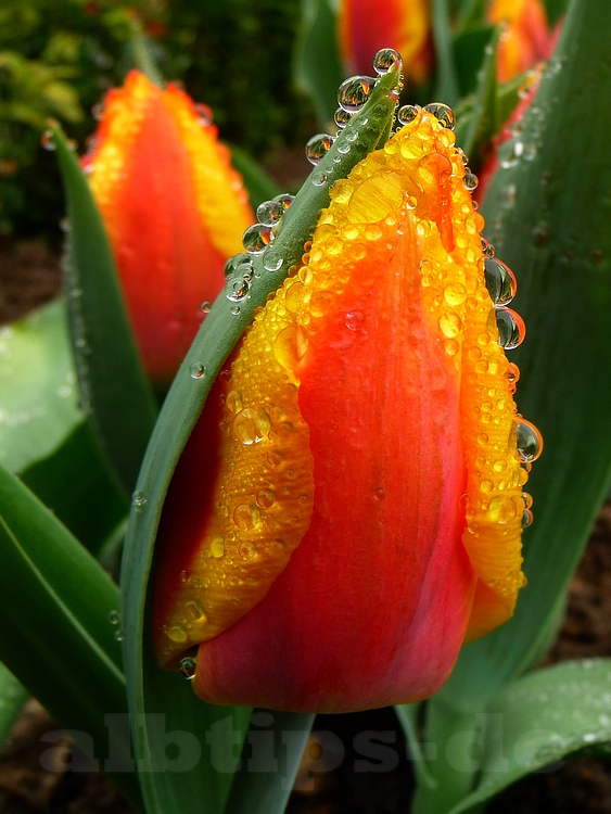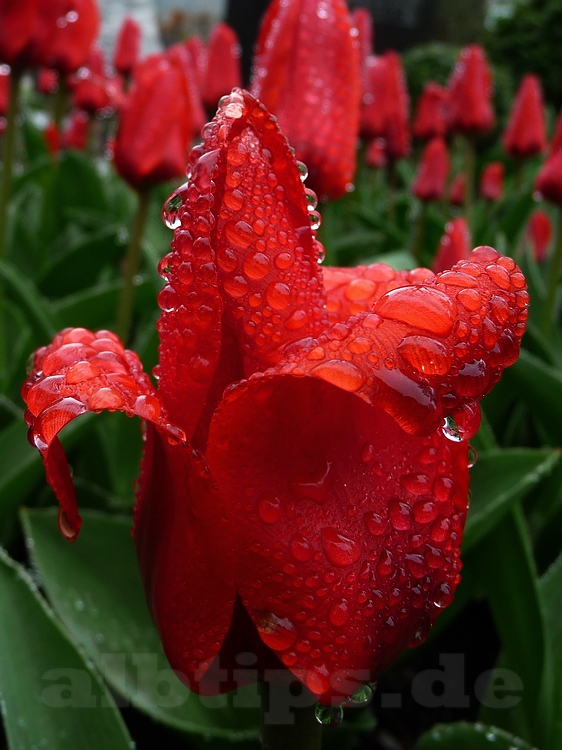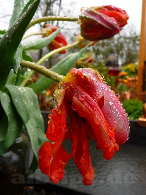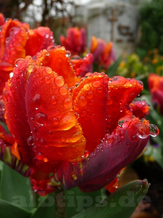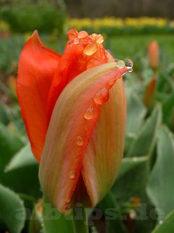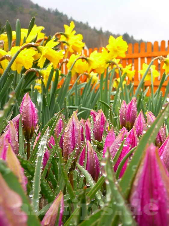 Der Nieseltau auf den bunten Blütenblättern ließ die wenigen schon aufgeblühten Sorten bei der Gönninger Tulpenblüte wie kleine Wunderwerke der Natur wirken.