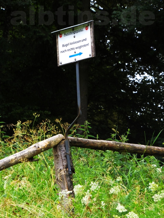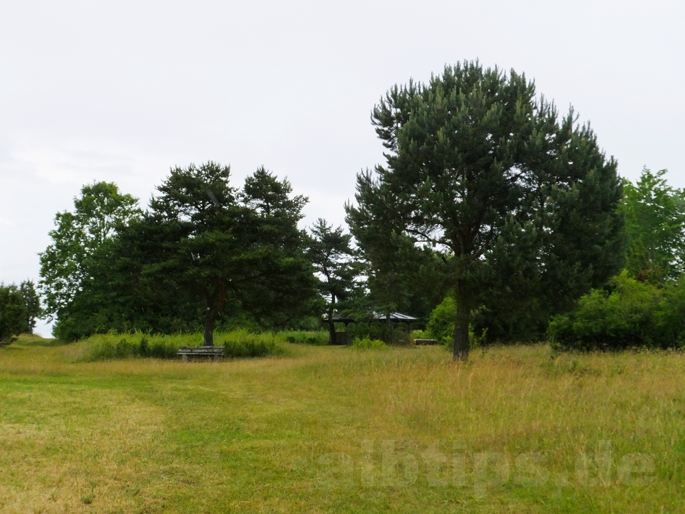Das Wanderzeichen Blaue Gabel lenkt scharf links auf einen Wiesenweg unterhalb des steilen Hangs. Nach etwa 350 Metern zweigt man halblinks ab. Der Pfad geht im Zick-Zack die Wacholderheide hinauf und in den Wald hinein. Nach weiteren 350 stetig ansteigenden Metern geradeaus kann man einen Schlenker nach rechts machen. Wer halb zugewachsene Wege nicht mag, geht stattdessen einfach geradeaus weiter bis man auf einen breiten Schotterweg trifft, dort links.