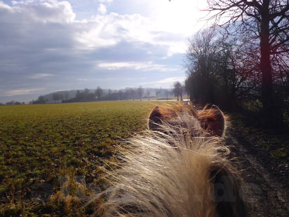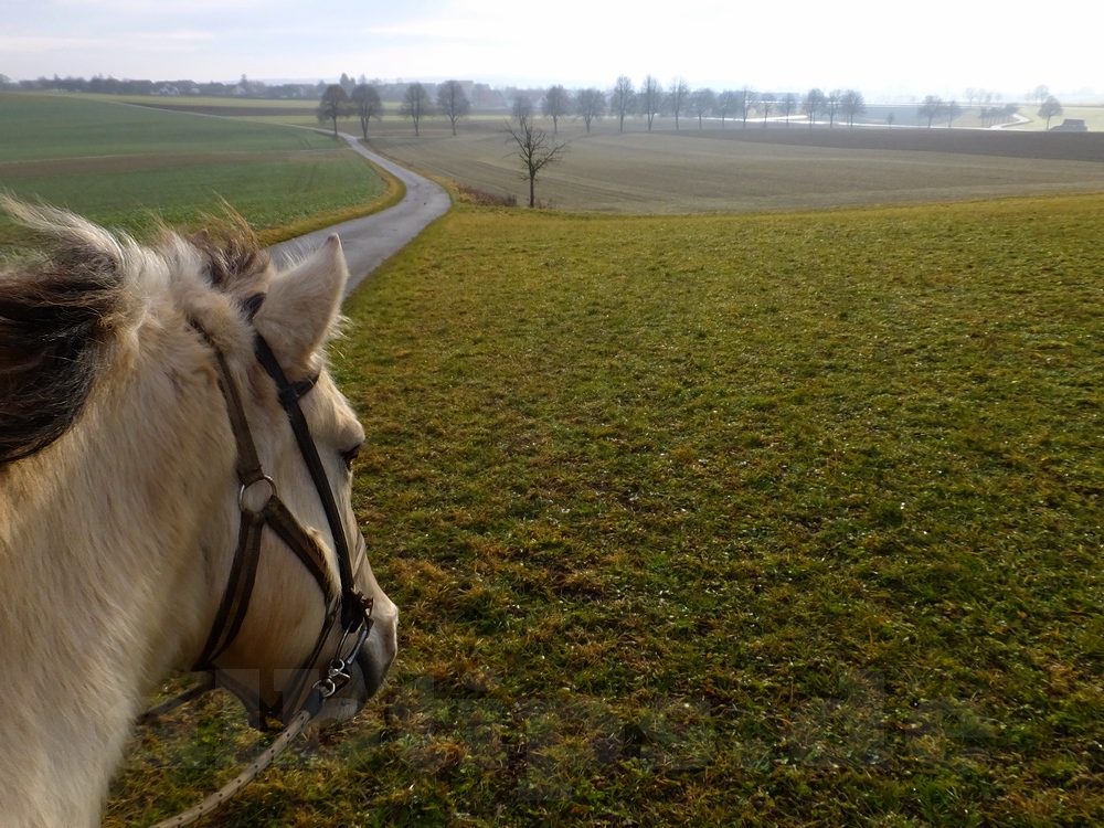 Obwohl die Lufttemperaturen im Plusbereich liegen, ist der Waldboden an vielen Stellen gefroren. Mit Bedacht setzen Pferd und Muli die Hufe und tragen uns durch die winterlich ruhige Landschaft.