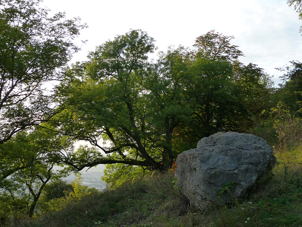 Nach einer Linkskurve sieht man rechts oben eine Felswand, die vielen seltenen Pflanzen und Tieren Schutz und Lebensraum bietet. Schon bald erreicht man ein Stück Mauer, kurz danach sieht man schon das Ziel, den Achalmgipfel (707 m ü. NN).