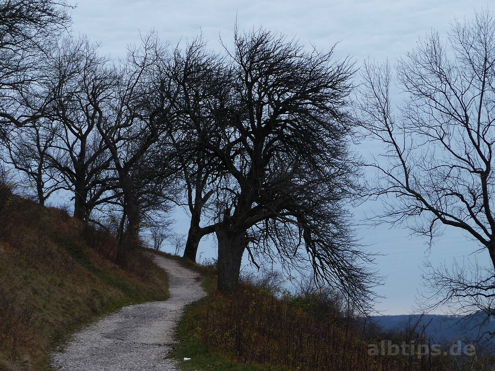 Auf halber Höhe quert man den Schotterweg, der später der Rückweg sein wird, und geht weiter gerade aus hinauf. Links und rechts befinden sich wunderschöne Wacholderheiden, Bäume, Sträucher und es bieten sich beeindruckende Ausblicke auf den Reutlinger Albtrauf und ins Albvorland.