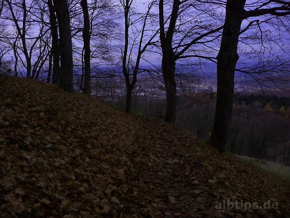 Zurück geht man erst einmal ein kurzes Stück den gleichen Weg und zweigt unterhalb der Felswand links auf einen schmaleren Pfad ab. Nach einem waldigen Weg rechts um den Berg herum spaziert man unter einer schönen alten Allee hinab bis zum Achalm Hotel und Restaurant. Dort wendet man sich nach rechts auf den Fußweg und geht parallel zum Sträßchen zurück zum Parkplatz.