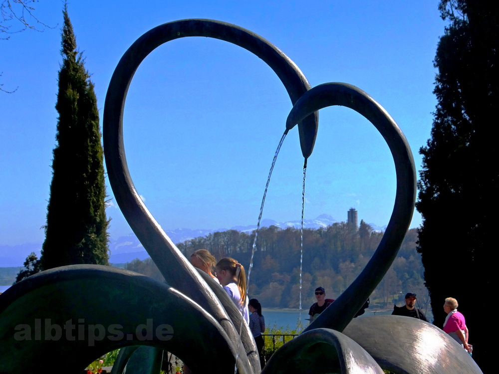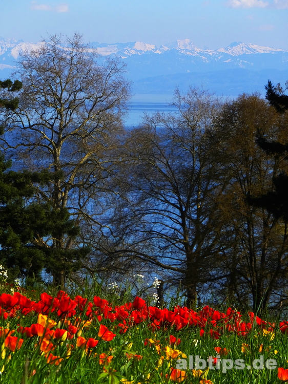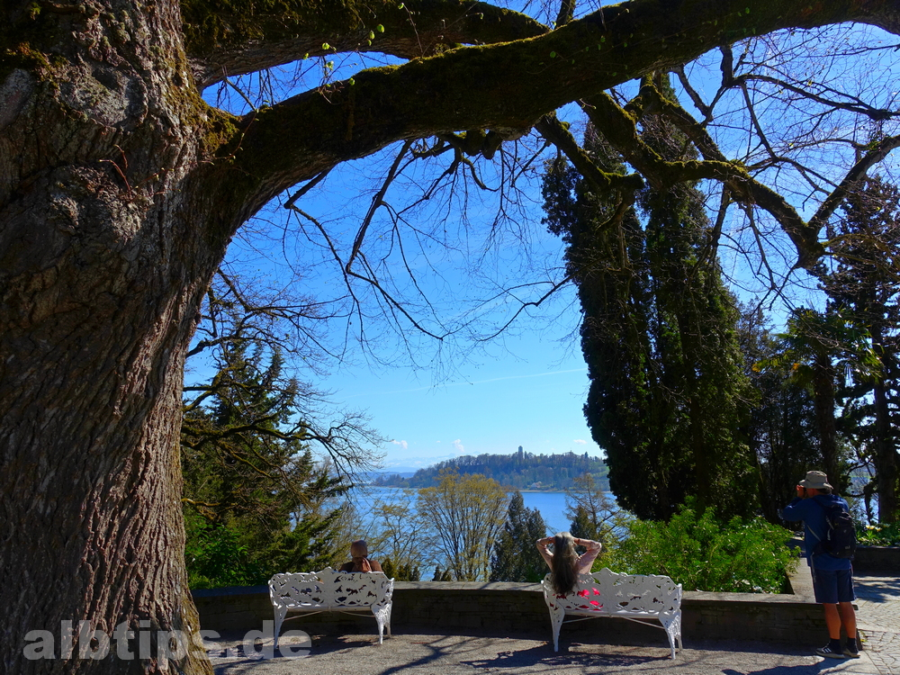 Von den mediterranen Terassen blickt man bei klarer Sicht nach Süden zu den Alpen über dem Bodensee. Es gibt etwa Brunnen, Wassertreppen, einen Dahliengarten und einen Staudengarten und sogar einen Weinberg.