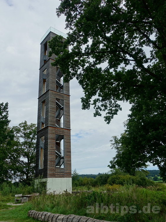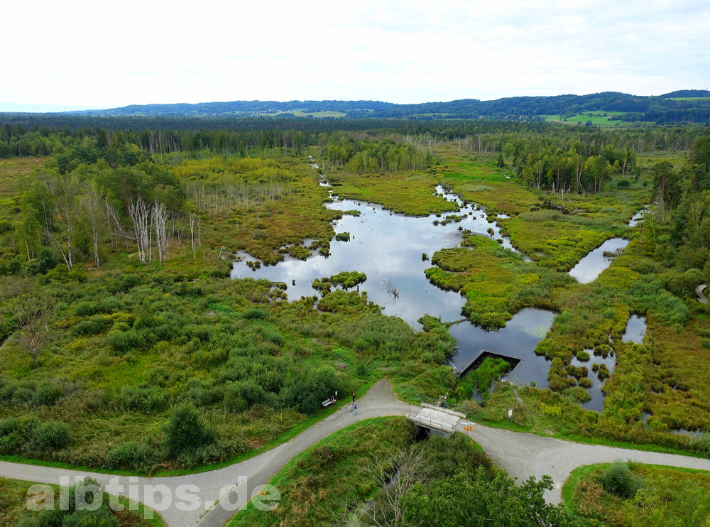 So kommt man direkt auf den Bannwaldturm zu. Der Aufstieg auf den 38,8 Meter hohe Aussichtsturm lohnt sich besonders bei guter Sicht. Man blickt über das Ried hinweg und mit Glück sieht man auch die Alpen in der Ferne.