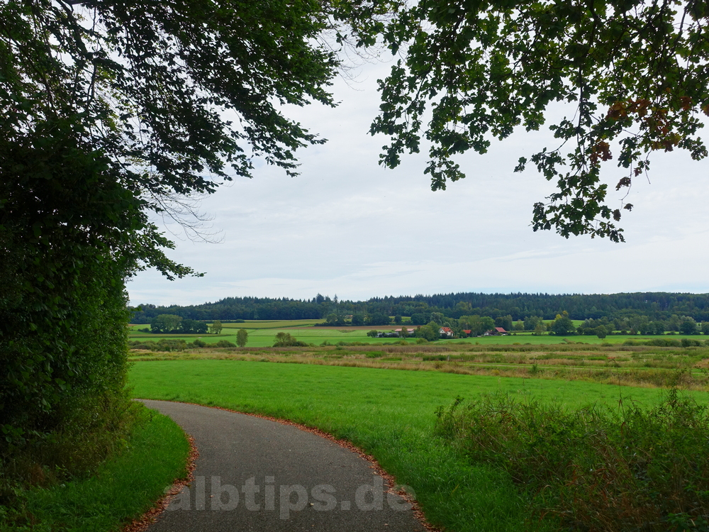 Kurz darauf kommt man aus dem Wald und hält sich rechts. Oben am Waldrand geht es links. Schon bald bietet sich – nur bei klarer Sicht – ein toller Blick nach Süden zu den Alpen.