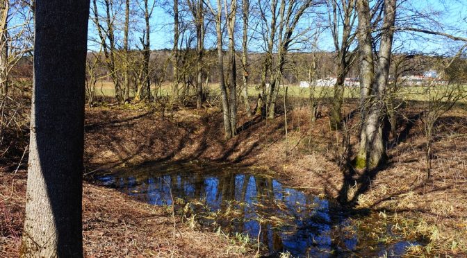 Nach dem Abstecher geht man weiter den Weg hinauf und oben am Querweg rechts. Wo der Waldrand links endet, biegt man links ab und kurz darauf nochmal links, ebenfalls am Waldrand. Der Weg entlang beeindruckender alter Bäume flacht ab und man nimmt den Wiesenweg nach rechts. Bald überquert man einen Teerweg. Nach links und oben am Waldrand nochmals links kann man einen Abstecher zur Hagsbuch-Hüle (ca. 800 m) machen. Andernfalls geht es weiter geradeaus und nach zwei kurz aufeinanderfolgenden Hecken rechts hinab zu einem breiteren Weg.