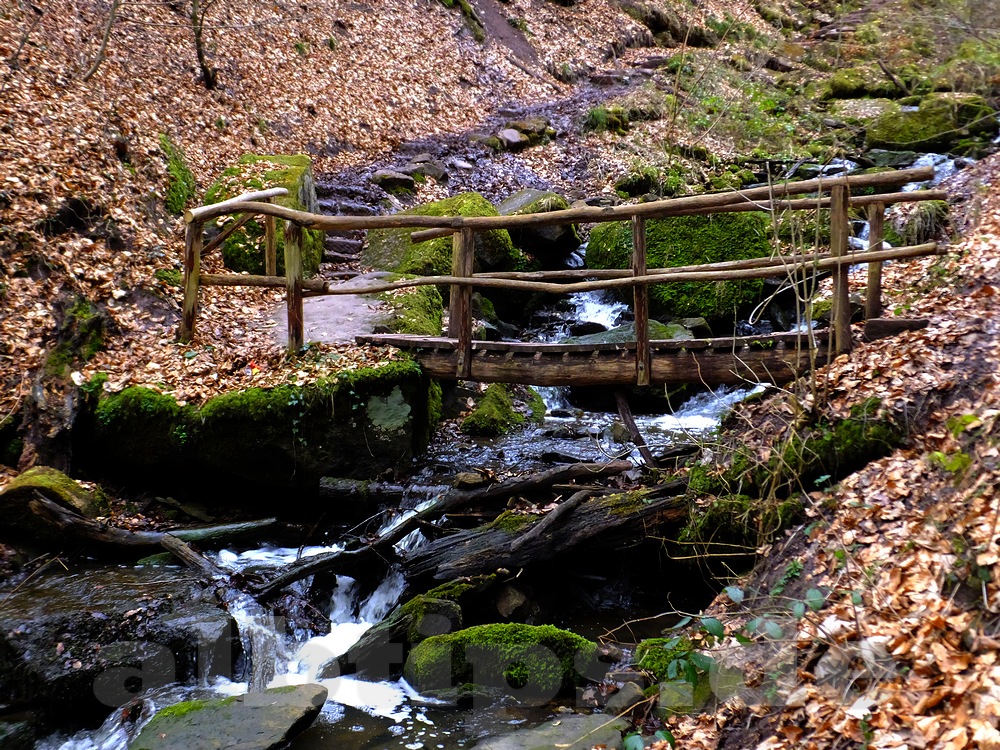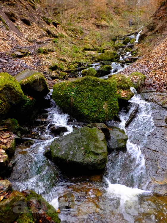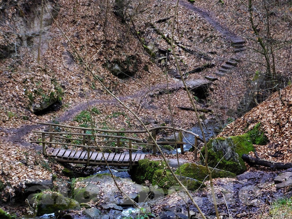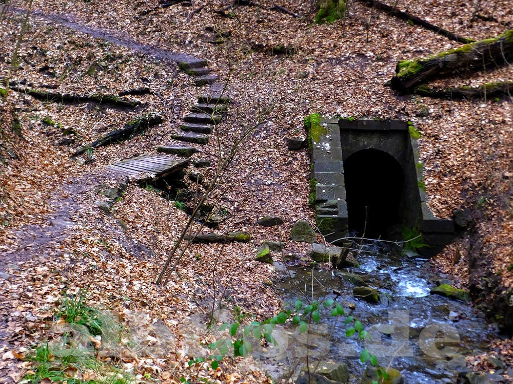 Man geht zu Fuß unter der Unterführung zurück, kurz danach führt ein Pfad links hinab in einen Taleinschnitt. Bald schon sieht man den oberen Teil der Wasserfälle – allerdings nur, wenn es zuvor geregnet hat. Das Wasser verschwindet in einem Stollen unter einem Bahndamm der Gäubahn. Dahinter gibt es noch einen unteren, weniger steilen Teil der Wasserfälle. Derzeit ist der Pfad entlang des Wasserfalls naturgemäß sehr matschig.