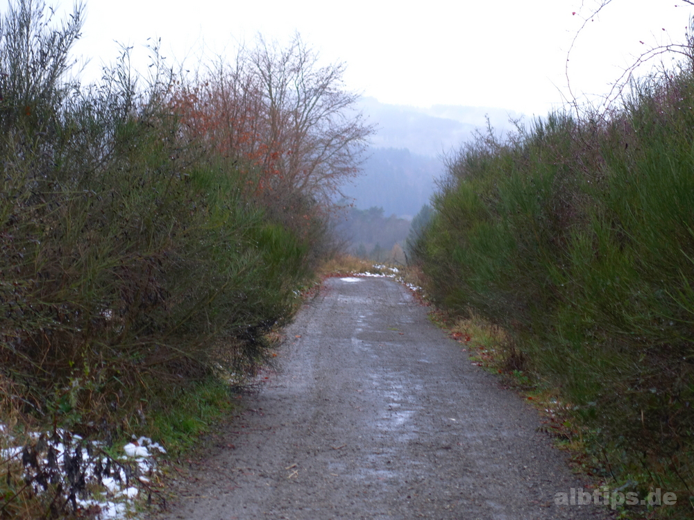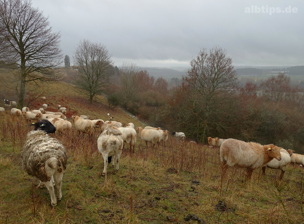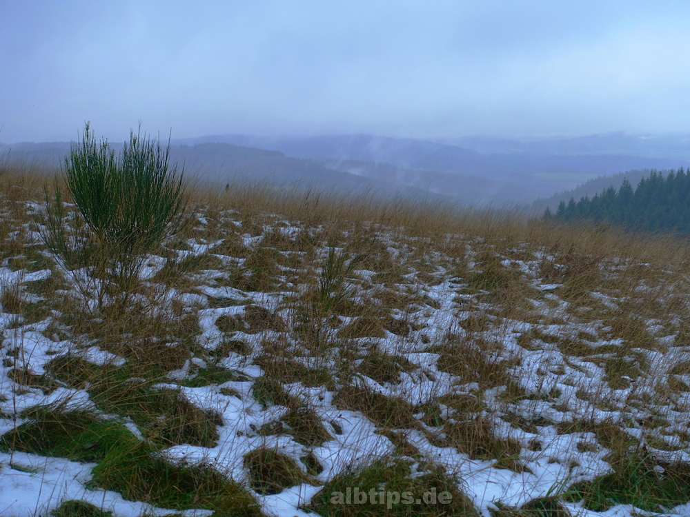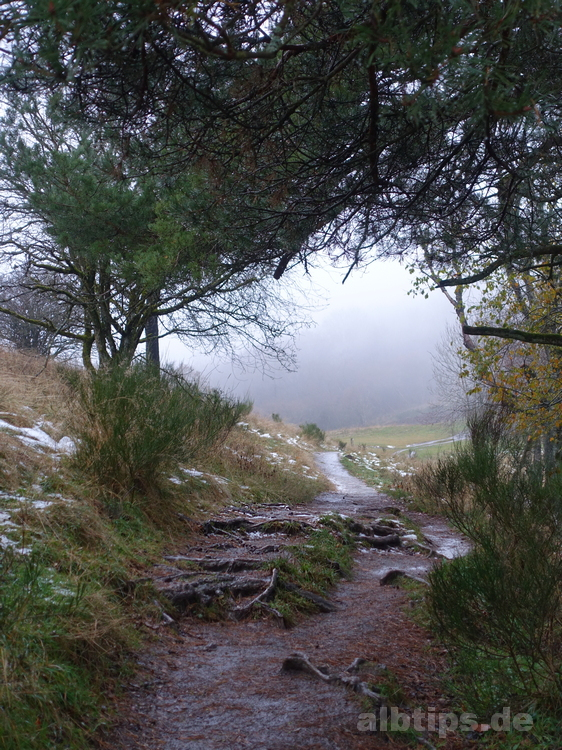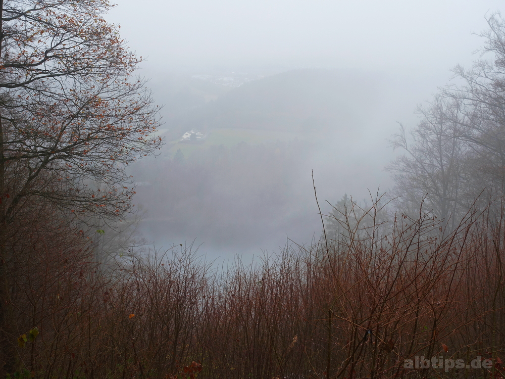 Über den Albrand hinaus geblick, aber nicht viel Sicht gehabt: Wie großartig muss die Runde um zwei und der Blick auf das dritte der Dauner Maar erst bei schönem Wetter sein!