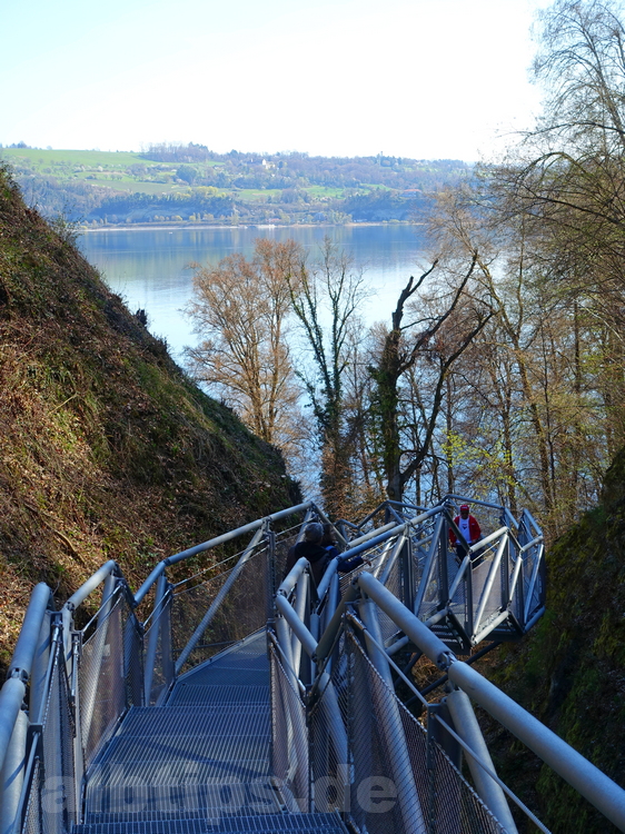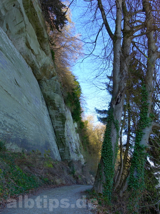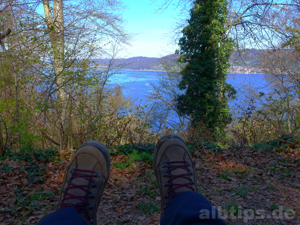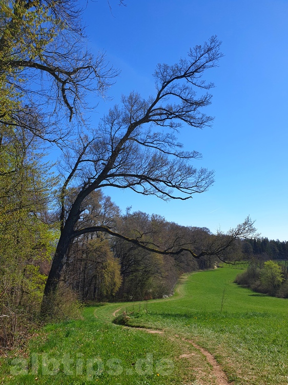 Man geht die Straße hinunter und biegt bei der zweiten Gelegenheit rechts auf den Schotterweg ab. Dieser führt durch malerische Streuobstwiesen oberhalb des Ermstals mit wunderschönen Blicken Richtung Hohenurach, zum Albtrauf, zum Neuhäuser Weinberg und in die Weite.
